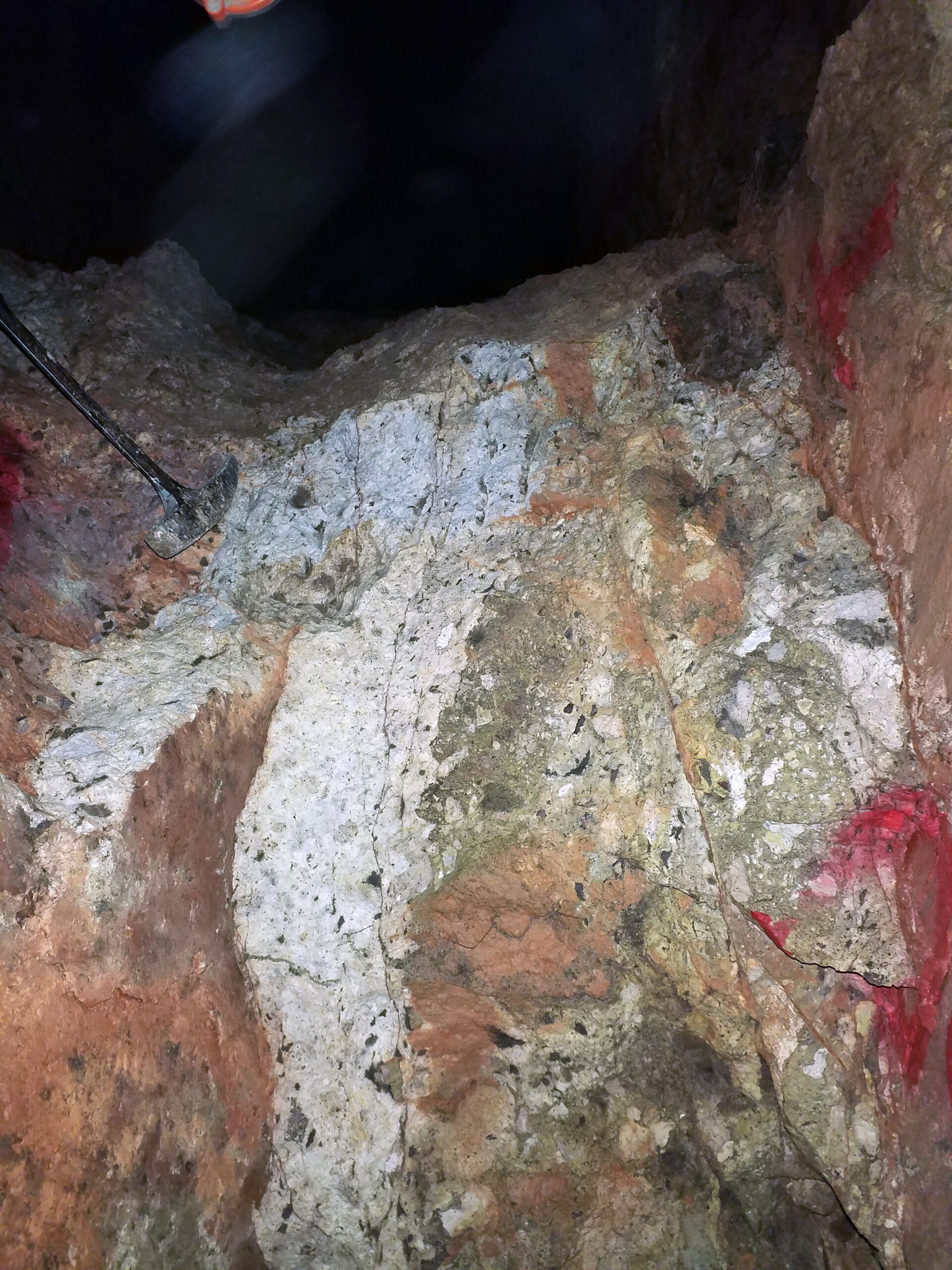 Los Lentes Level 1040. Sample 27430 contains 15.42 g/t gold and 7 g/t silver across 0.6 m. The rock is an aggregate quartz breccia in a green quartz-epidote matrix hosted in pervasively clay-altered rhyolitic lapillistone.