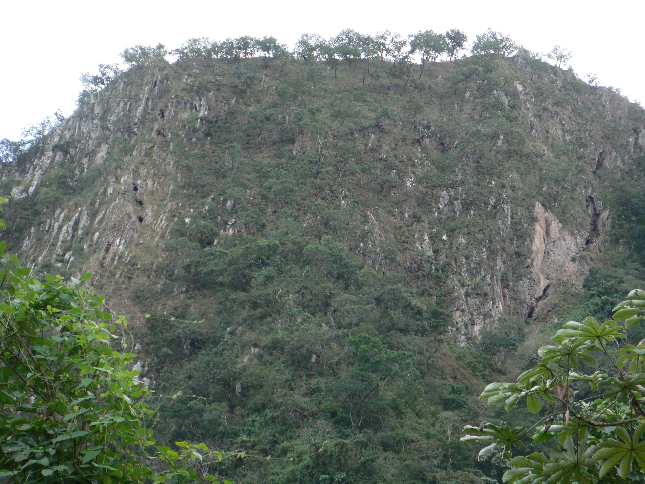 View of La Flauta del Placer looking southeasterly. Workings along La Tarántula Vein are to the right. La Víbora is the series of pits on the left. Hostrocks are rhyolitic ignimbrite with columnar joints of Paleocene or younger age.