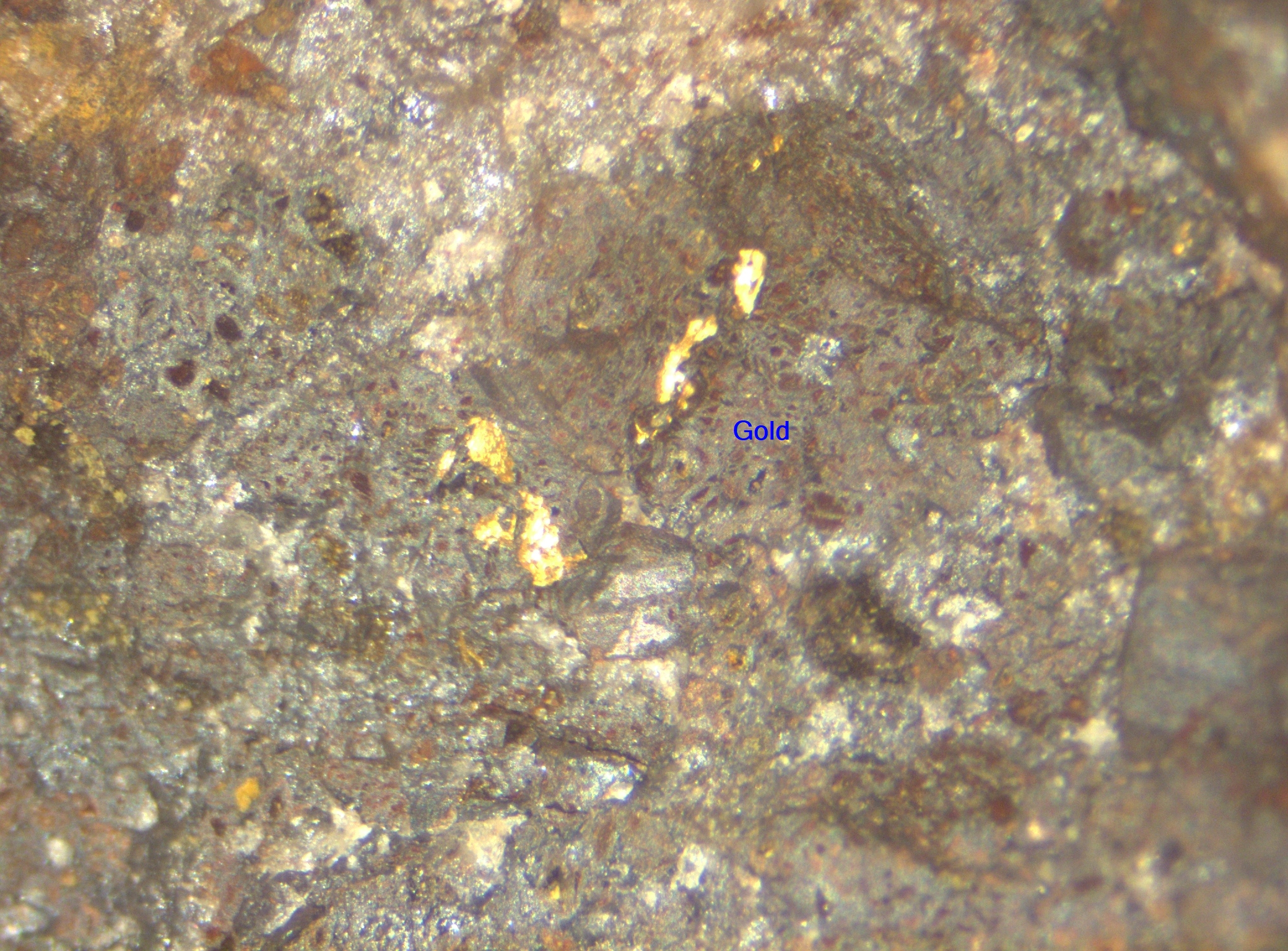 Microphotograph of HBM-73175 showing coarse gold. This sample assayed 184.9 g/t Au, 61 g/t Ag, 226 ppm W, 0.22% Cu, >1% Pb and > 1% Zn across 1.2 m (427243E, 2565175N, 575 elev).